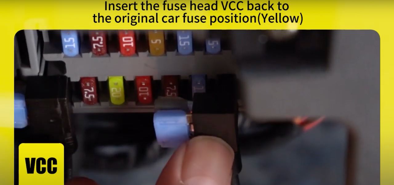 الآن، قم بتوصيل السلك الأحمر بفيوز تشغيل الملحقات (ACC) عبر الفيوز تاب، والسلك الأصفر بفيوز التيار المستمر (VCC) عبر الفيوز تاب الخاص به.