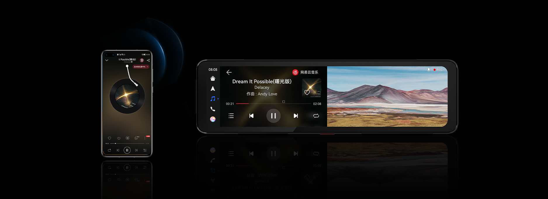 手机听歌、通话,上车自动流转至原车音响播放,打开的导航信息,连接后自动切换智慧后视镜显示。