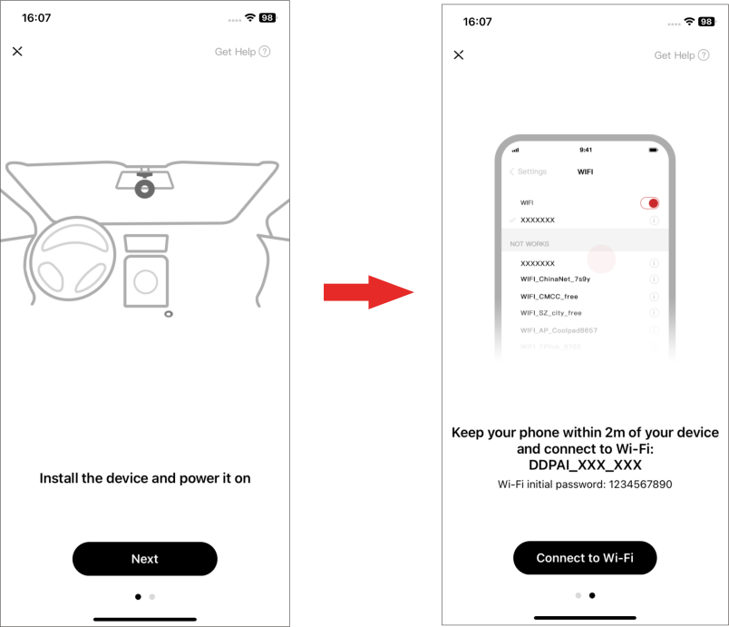② Tap “Next” > “Connect to Wi-Fi” in turn, and the detected Wi-Fi of the Dash Cam will be displayed.