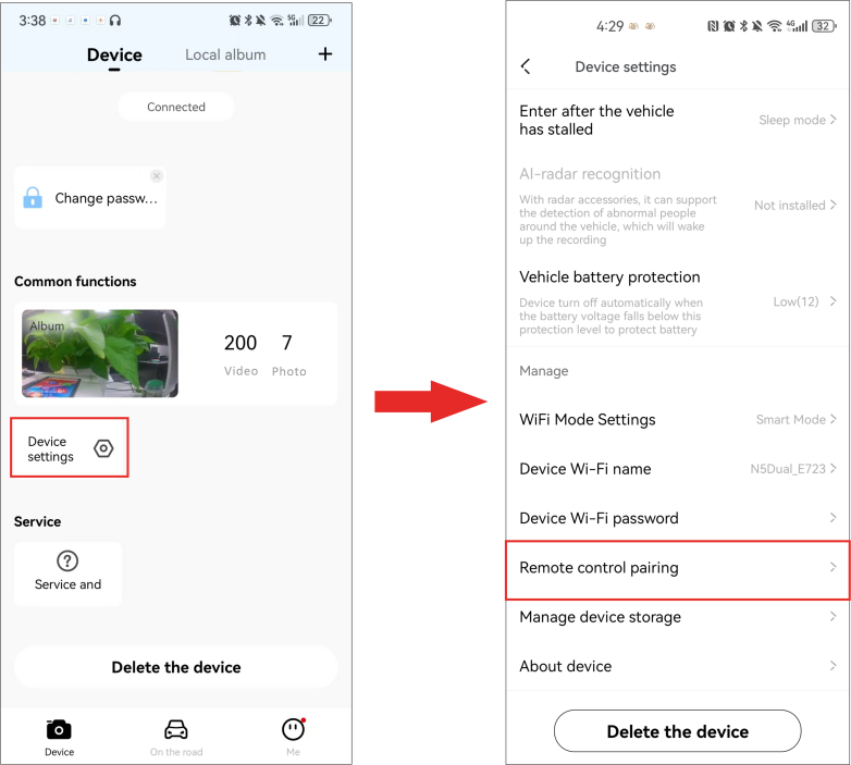 - After connecting the dash cam to the“DDPAI”app, enter the ‘Device’ Interfaceof the app, then tap “Device Settings” > “Remote Control Pairing”.