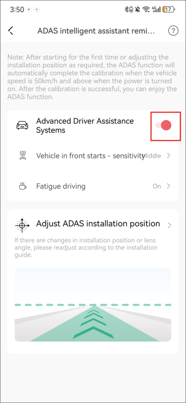 Enable the “ADAS Driver Assistance” switch to turn fatigue driving alerts on or off. When enabled, voice prompts will remind users to rest or stay alert during long drives.