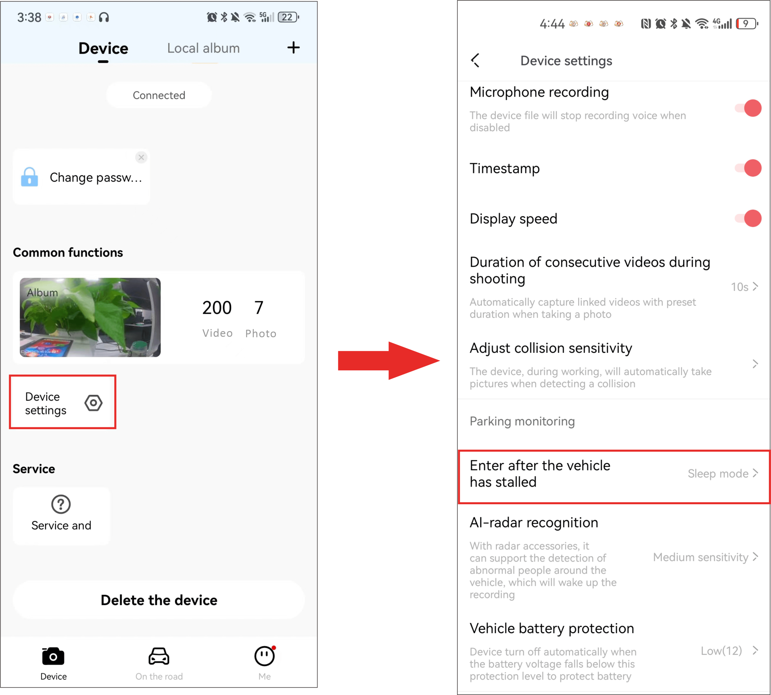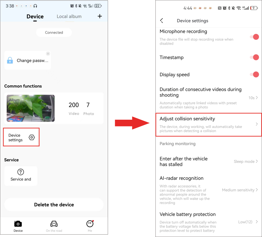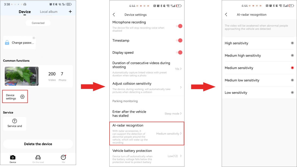 After the mobile phone is connected to the Dash Cam, open the app, and tap “Device Settings” > “AI-radar recognition”.