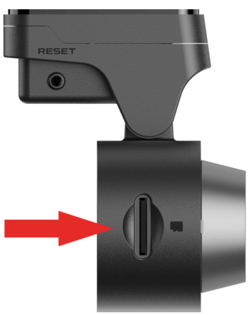 Please make sure the Dash Cam is turned off first. Make sure the lens of the Dash Cam is facing down, the chip of the memory card is facing up. Then insert the memory card half way in (refer to the silkscreen printed pattern beside the memory card slot) and use the finger nail or a paper clip to push the card all the way inward until it clicks and locks in place.